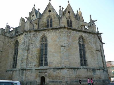 Mirepoix. Catedral de San Mauricio. Vista desde el sureste. (Foto de Jesús Díaz). La fachada sur finaliza en su lado occidental con la gran torre campanario que da prestancia y personalidad al bello edificio.