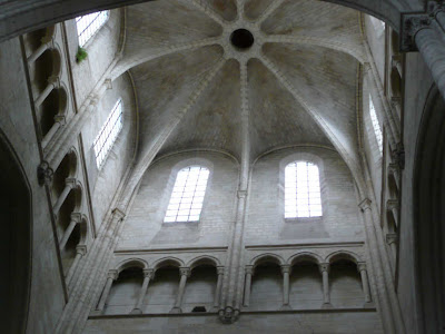 Laón. Capilla románica de los templarios. Bóveda central nervada. (Foto de Jesús Díaz). La bóveda del cuerpo central octogonal luce nervaduras y plementos de piedra y un óculo-clave central decorado con un Agnus Dei crucífero.